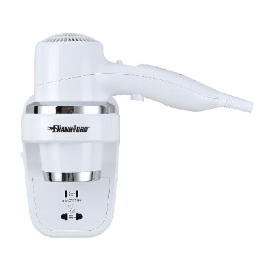 Asciugacapelli a parete Feng, potenza massima 1800 W. Alimentazione 100-130 V, 220-240V - 50 Hz. Velocità del motore: 5500 giri al minuto. Codice di protezione IP22. Presa per rasoio 110 V + 220 V. Scocca esterna in ABS, colore: bianco-cromo. Peso netto 1,3 kg, peso lordo 1,5 kg.