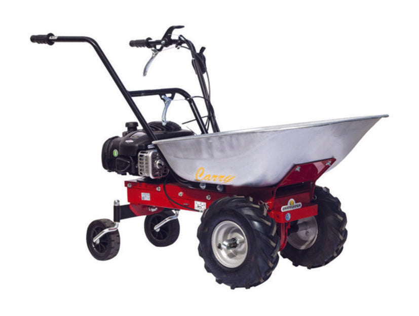 motocarriola a scoppio progettata per gli spostamenti di carichi in piano - l’alta manovrabilità e la semplicità di utilizzo rendono CARRY uno strumento perfetto per trasportare piccole piante, legna, fogliame e residui vegetali - la pratica vasca ribaltabile permette un facile rilascio del carico a terra - uso consigliato fino a kg.100 - cambio a 2 velocità di cui 1 avanti e 1 retromarcia - trasmissione a vite senza fine in bagno d'olio e cinghie - avviamento a strappo con autoavvolgente - vasca zincata da lt.85 ribaltabile in avanti - portata massima kg.100 - freno automatico di stazionamento - ruote motrici: tractor, pneumatiche 13×5,00-6" con semi-differenziale meccanico - alimentazione: benzina - capacità serbatoio lt.0,8 - motore B&S 125 CC - dimensioni: cm.65x145x100h. peso kg.54
