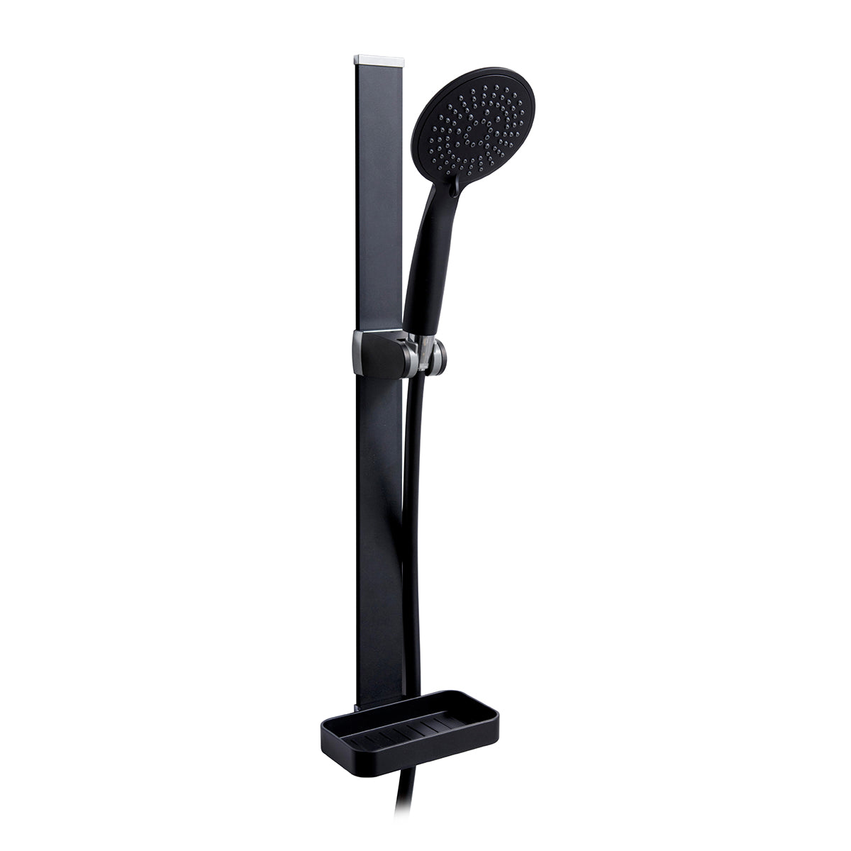 Saliscendi doccia magnetico composto da: doccetta 5 funzioni in ABS, water saving, diametro 110 mm, asta piatta in alluminio. Supporto magnetico in ABS scorrevole. Laccio doccia lungh. 150 cm, con porta sapone. Altezza totale 60 cm, fissaggio con biadesivo incluso