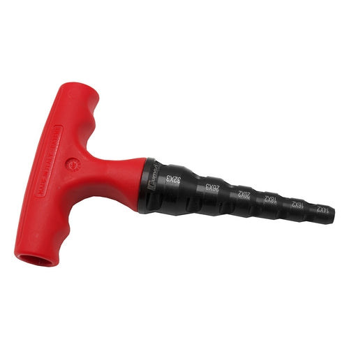 Sbavatore calibratore multimisura con corpo a sezione cilindrica in acciaio speciale temprato e brunito. Per sbavare la parte interna del tubo multistrato e 6 misure per ricalibrare il diametro interno dopo il taglio.