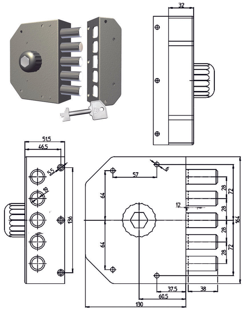 serratura con cilindro a pompa con scrocco - applicazione: applicare - 4 catenacci - comando interno: pomolo - finitura verniciata - 1 punto di chiusura - corsa catenacci mm.38 - lunghezza cilindro mm.60 - accessori inclusi: ferrogliera, mostrina esterna, viti